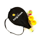 Our 19 inch Mini Tennis Racket in a set with a headcover which has a convenient drawstring compartment for carrying three tennis balls, and three Mini Tennis Balls.
