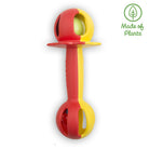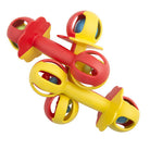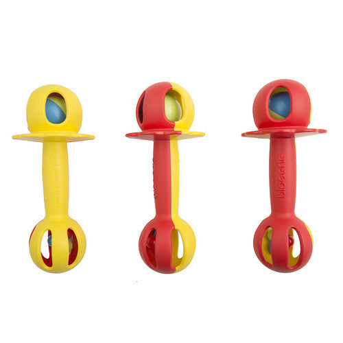 Two different sounds, bright colours and loads of baby fun in this stimulating two-in one-rattle. Bright, red and yellow body, with blue and green rattle balls; one main ball at the top, and four small balls in the base.