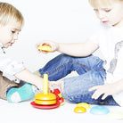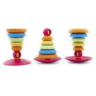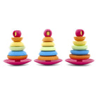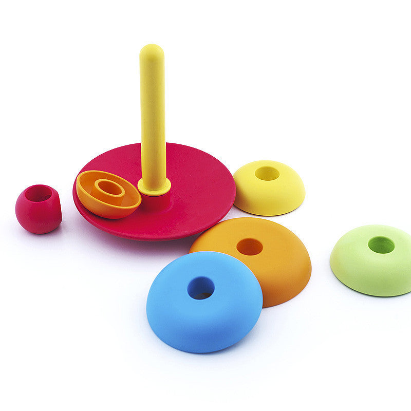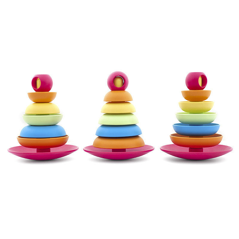 The stacking layers can be added in and out of sequence with alternating sides up. The result is a toy that helps develop motor skills, improves logic while stimulating with colour, shape, balance and motion.