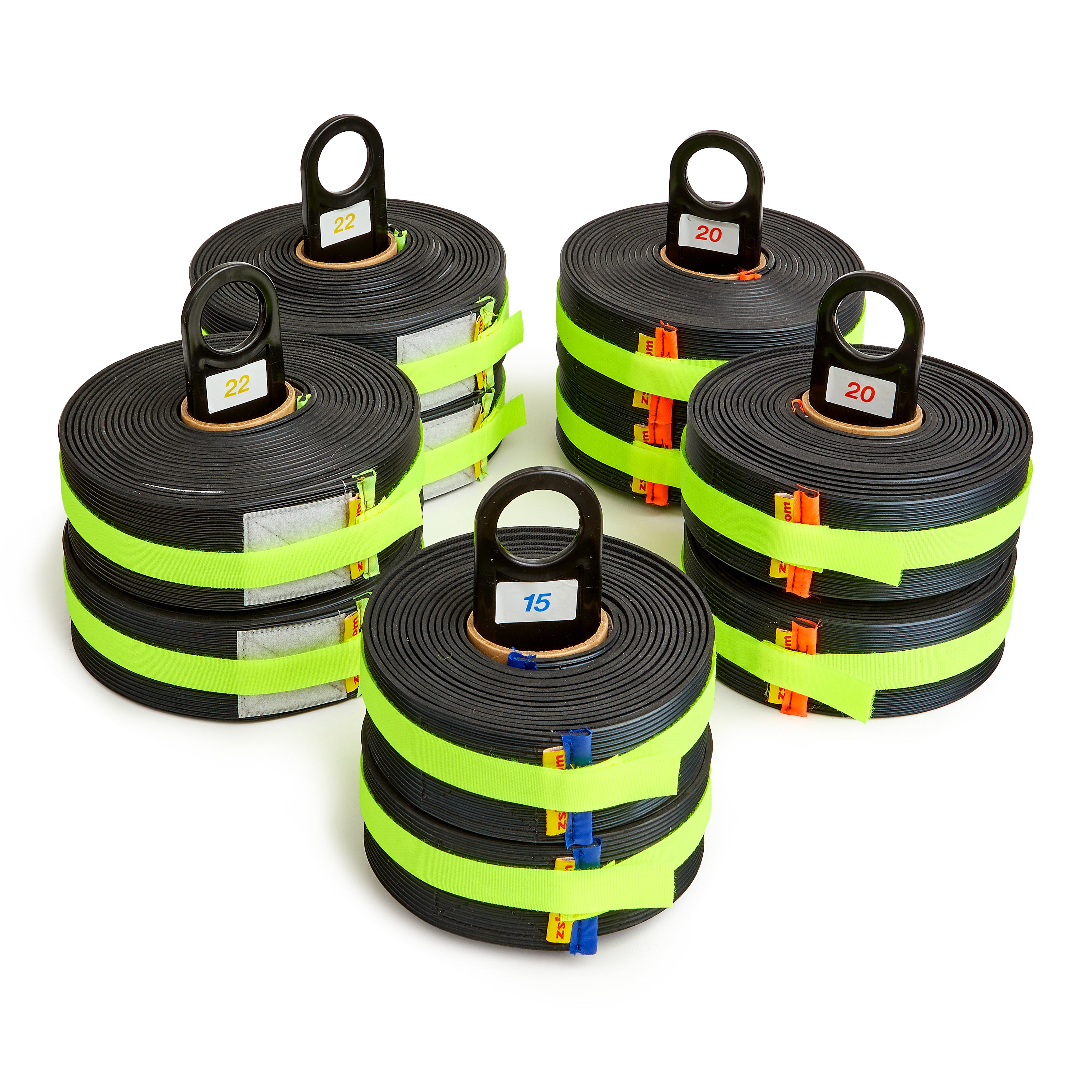 Pickleball Lines come two rolls to a convenient carry pole and are colour-coded and numbered for simple identification. The rolls are secured by a removable yellow Velcro strip.