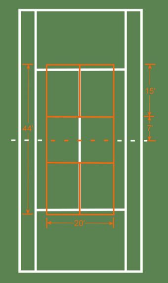 A pickleball court measures 20×44 feet. The court is divided similarly to a tennis court with right and left service courts and a 7-foot non-volley zone in front of the net (referred to as the “kitchen”). In pickleball, the same court is used for both singles and doubles play.
