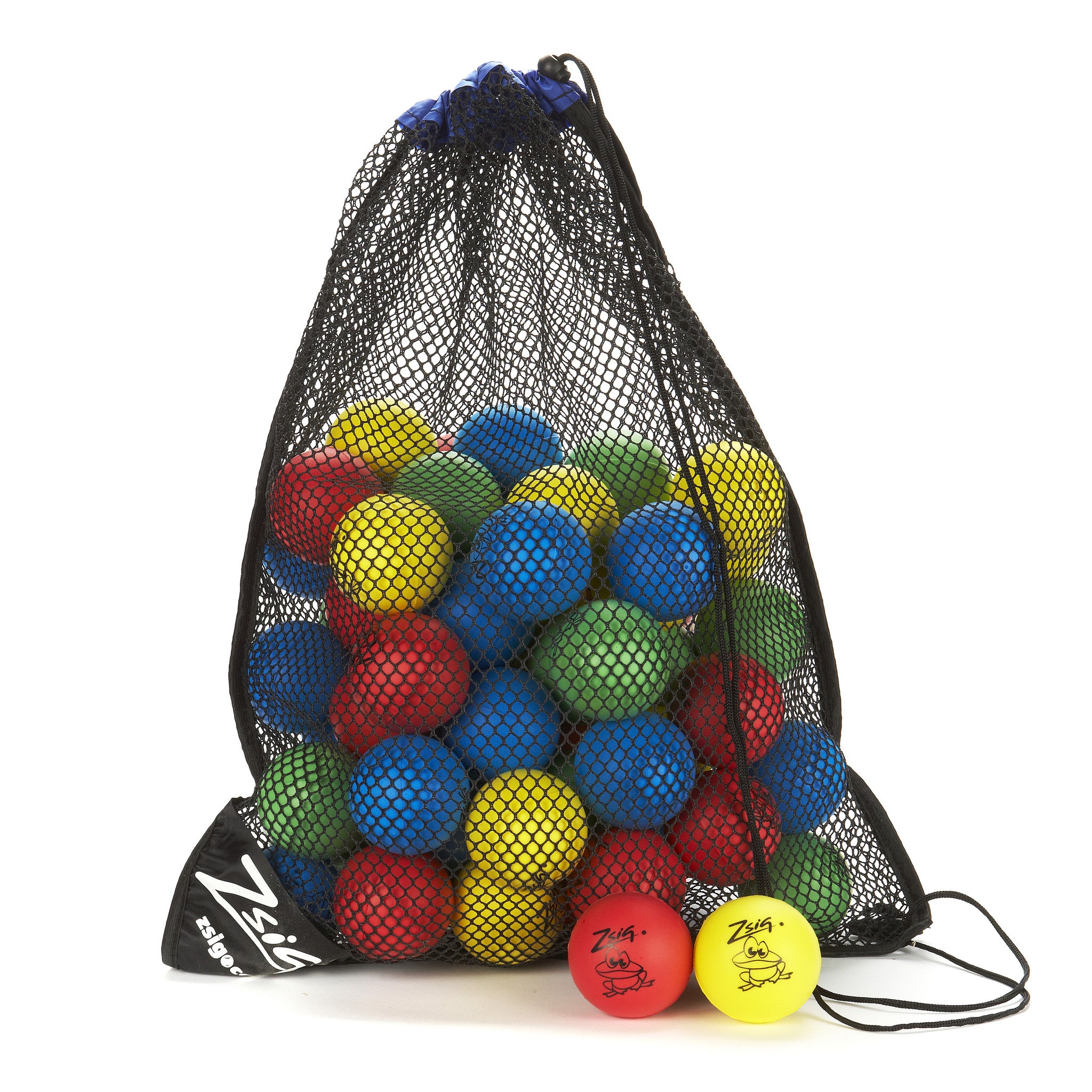60 Little Frog called George soft, safe balls in a quality drawstring bag - useful for storing and carrying the balls (hang it over a hook in the stock room).