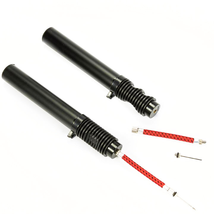 Fast dual action needle pump equipped with a flexible extension, which makes the job easier and helps avoid damaging the ball valve.