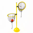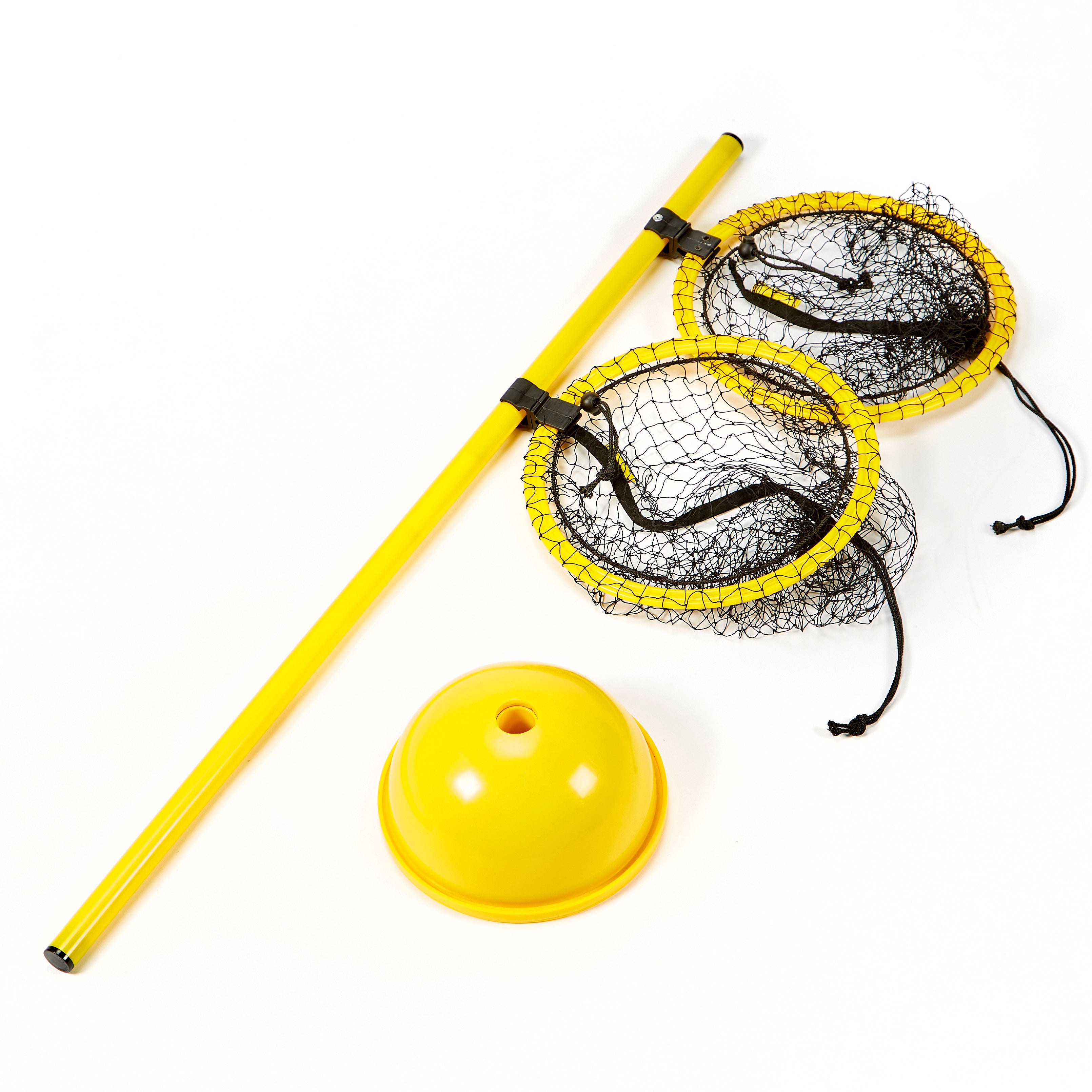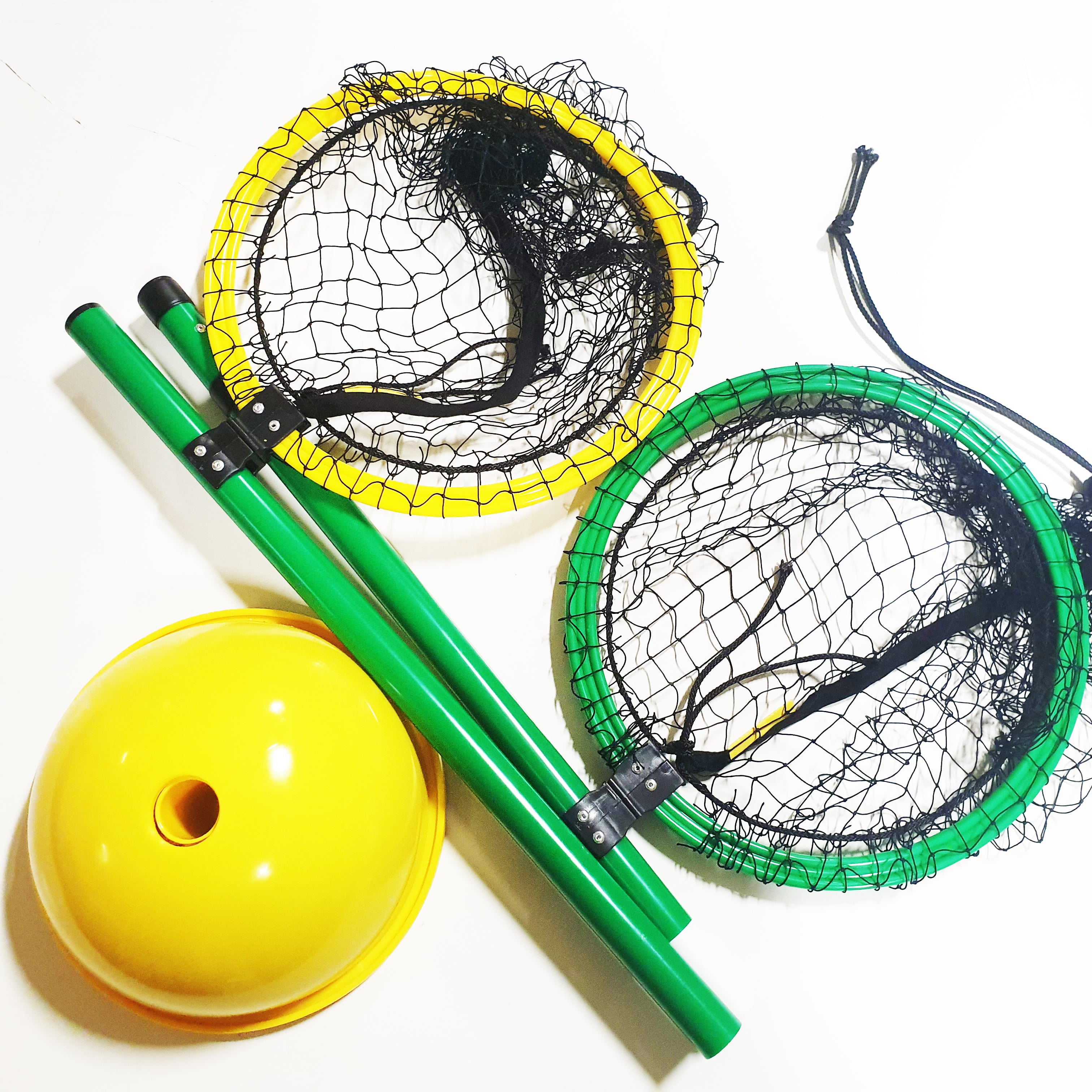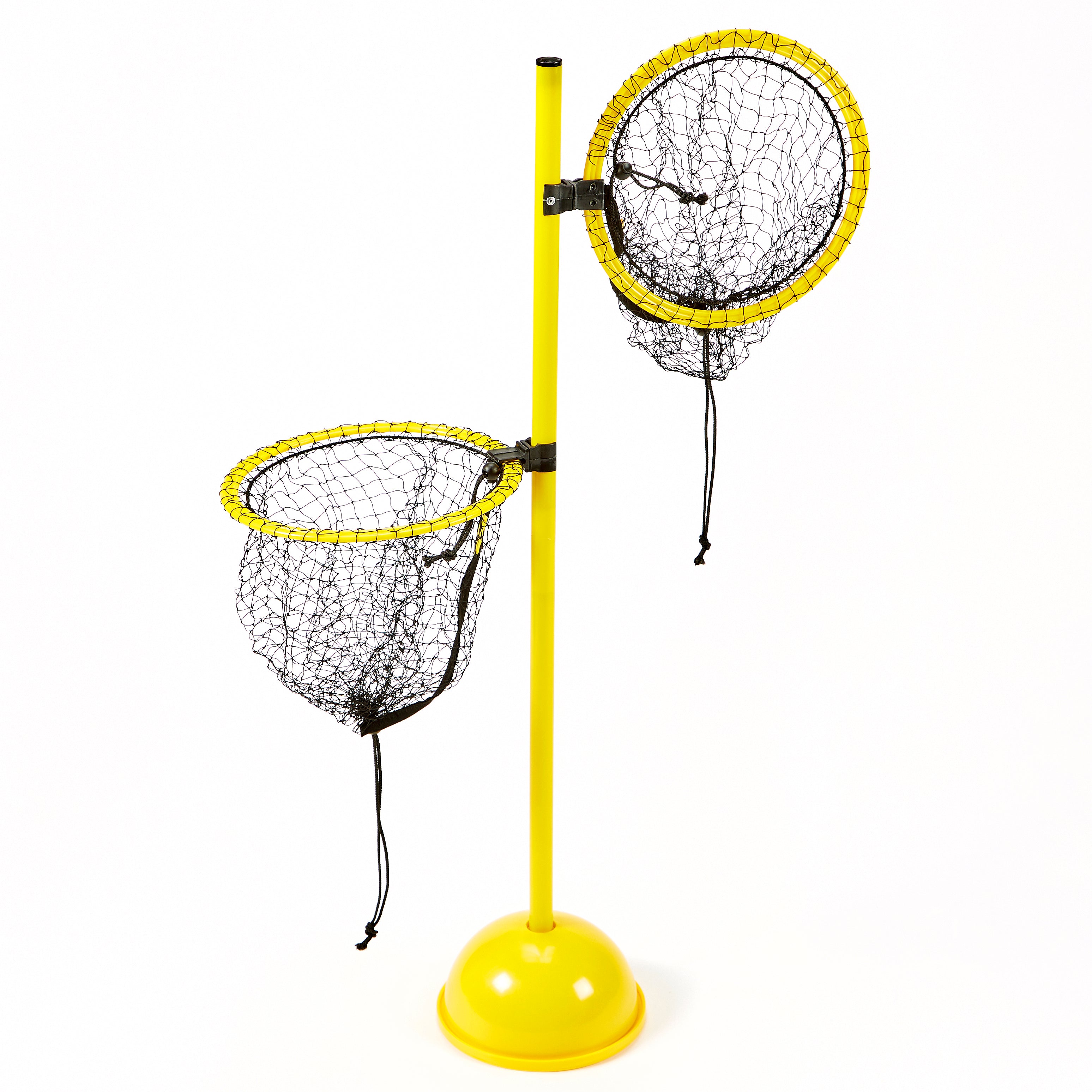 The set is an 100m pole, but it's one of our folding poles, which makes it easy to pack. The hoops are riveted to the pole, so won't slip, and we've made a net catching bag which opens at the base to release the balls.