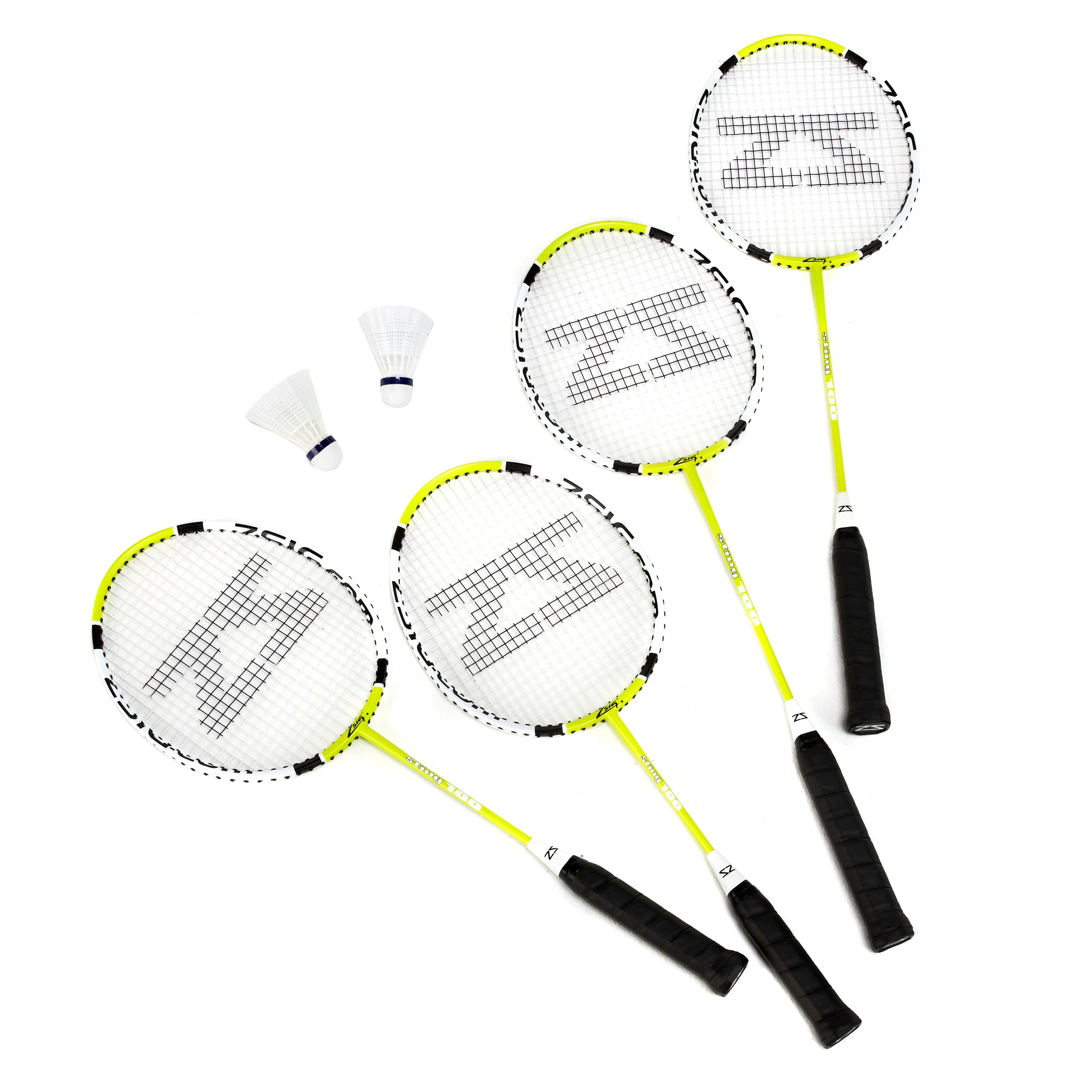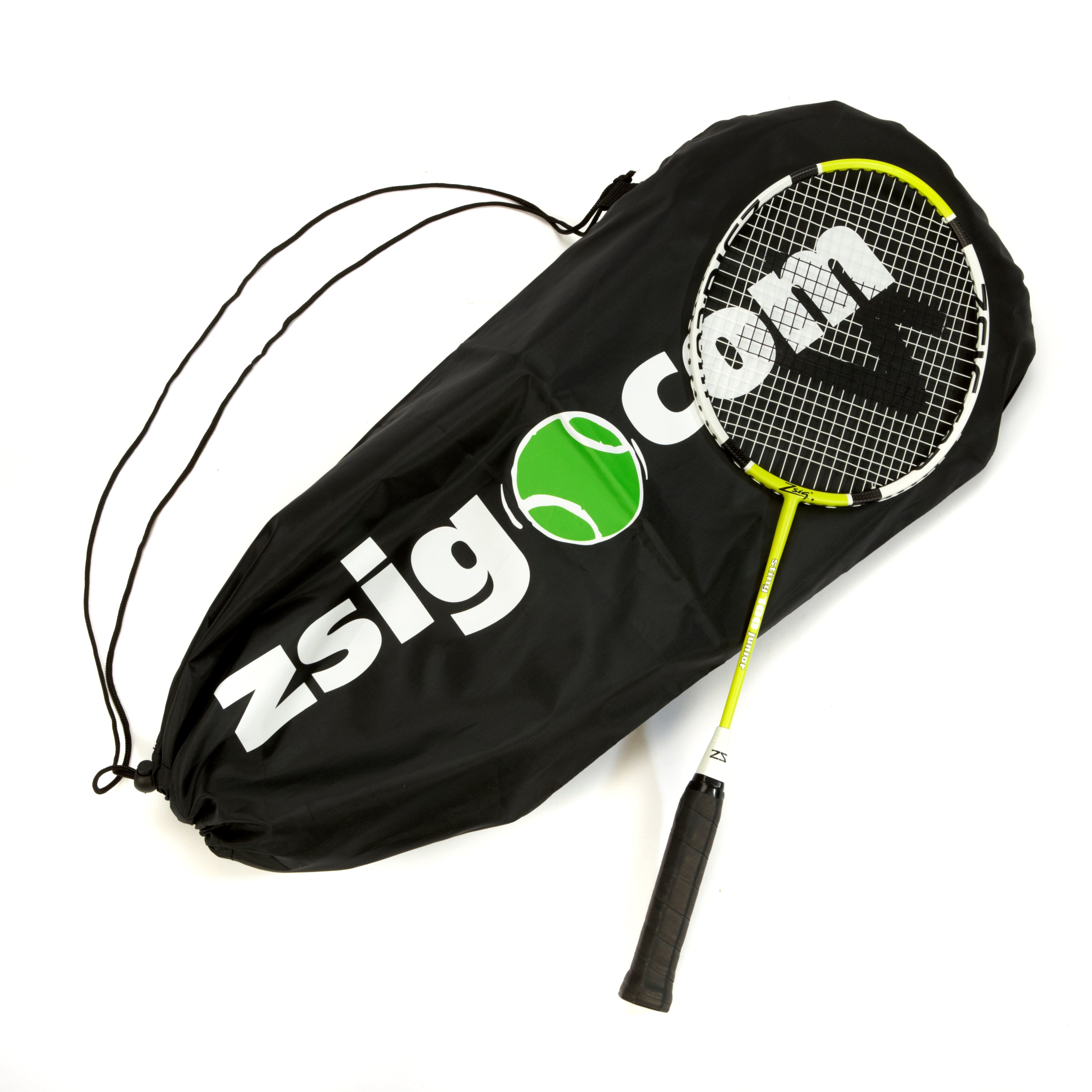 - 4 Sting 100 Badminton Rackets in a drawstring racket carry bag