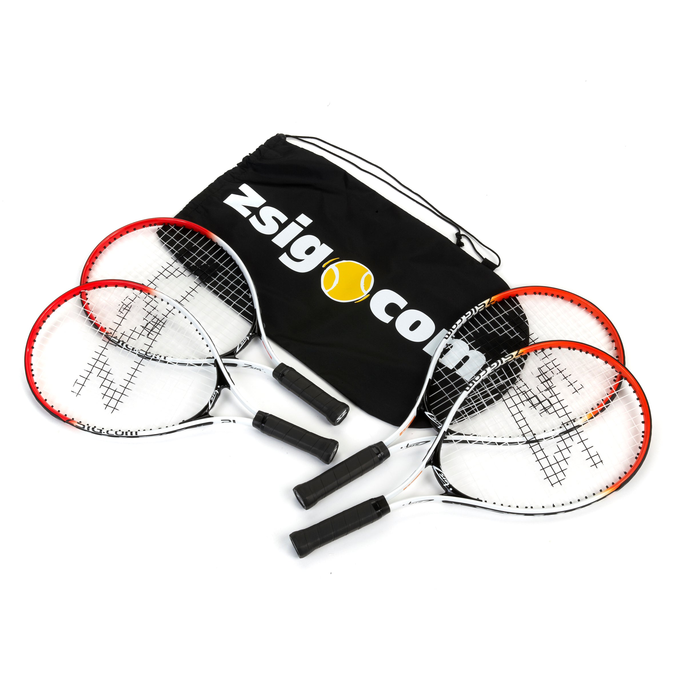 - 4 Mini Tennis Rackets (21 inch) in a drawstring racket carry bag