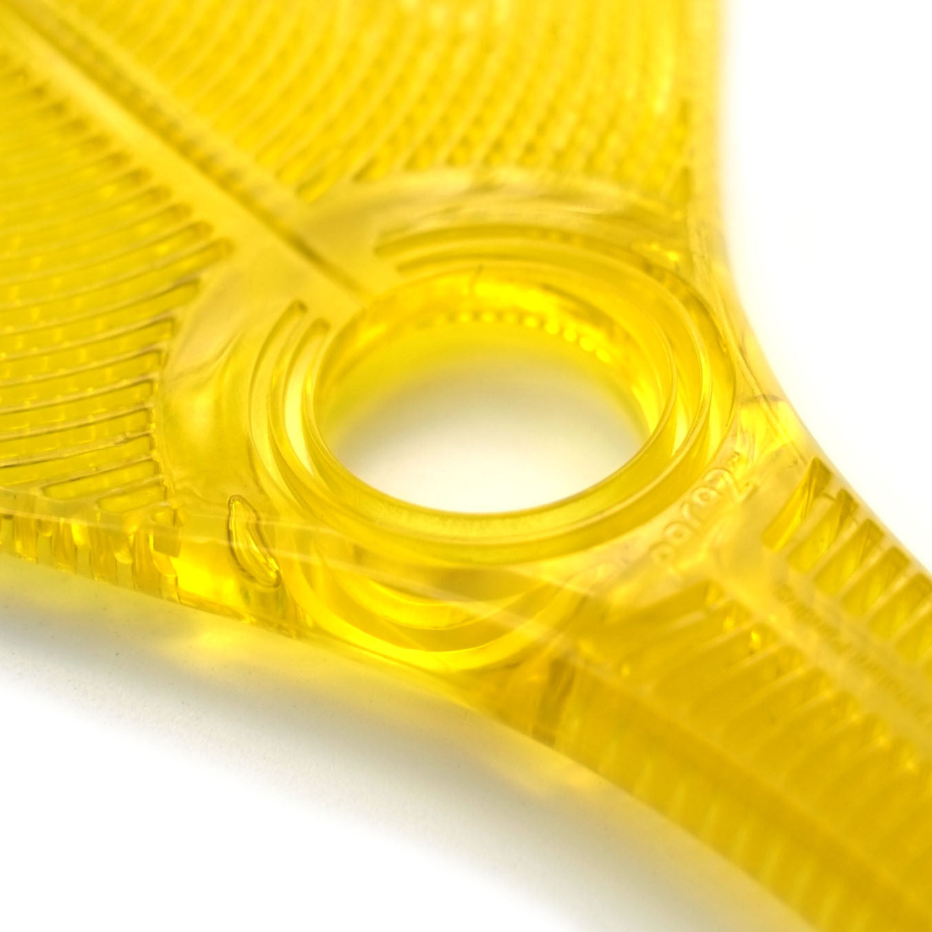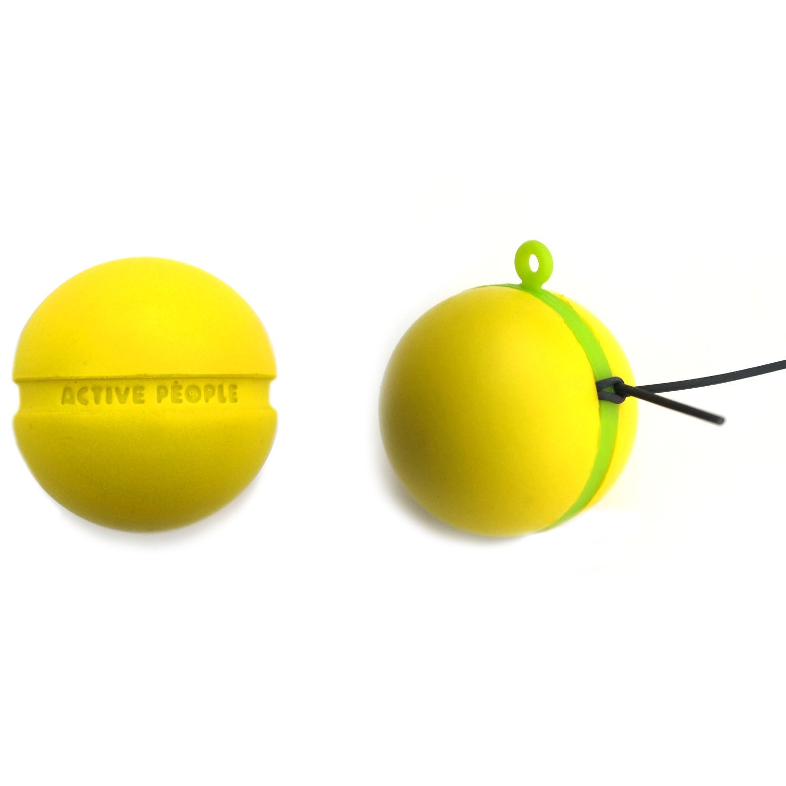 An elastic ring (spares included with the product) attaches the elastic string to the yellow play-ball.