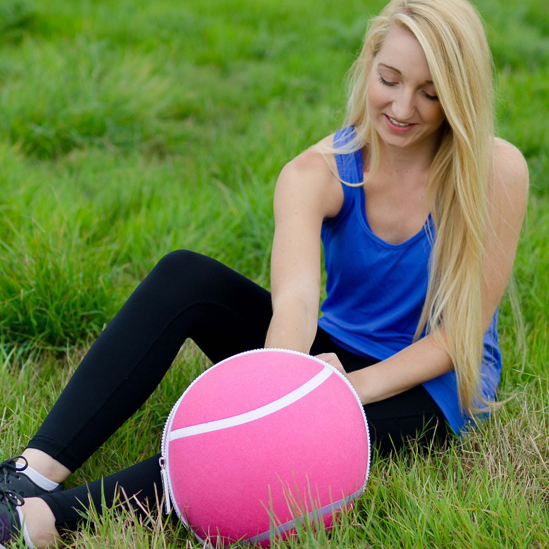 Featuring a strong top carrying handle, this tennis ball backpack is in bright pink felt with embroidered tennis ball markings, and two comfortable and adjustable shoulder strap. The rucksack is a solid felt shell which means that it holds its ball shape, has a lined, water-proof interior, a padded back for comfort, and opens up with an impressively tough, chunky white zip. Inside, you've got a range of useful separate compartments, including a zipped pocket for valuables, a key ring clip, a velcro-fastened mobile phone pocket, and pen holders.